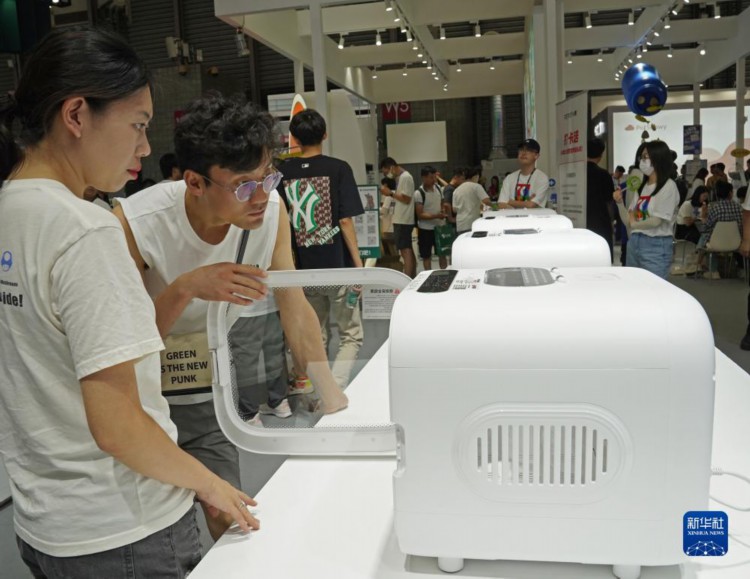 8月16日,观众在第25届亚洲宠物展览会上参观宠物智能烘干箱。