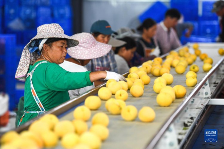 初秋时节,贵州省黔南布依族苗族自治州贵定县德新镇新铺村种植的黄桃迎来收获季节,村民忙着采摘、分拣、包装,供应市场。近年来,贵定县以“公司+合作社+农户”模式,打造黄桃种植基地,通过产业增收分红、基地务工薪酬、土地流转支付等渠道助农增收。