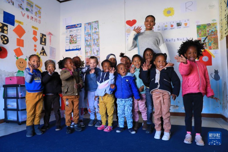 8月11日,老师与孩子们在南非德阿镇的一家儿童早教中心合影。 这家早教中心由中国龙源南非公司出资成立运营。在位于南非立法首都开普敦东北750多公里的小镇德阿,龙源南非公司出资成立运营了4家儿童早教中心,为贫困家庭的孩子提供了健康快乐的成长平台。目前已有近500名需要帮助的儿童被接收入学。 新华社记者 董江辉 摄
