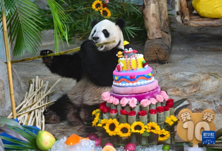 当日,位于海口市的海南热带野生动植物园为园内大熊猫“贡贡”和“舜舜”举行10岁生日庆祝活动。工作人员用冰块、竹笋、水果等制作生日大餐,为它们庆生。