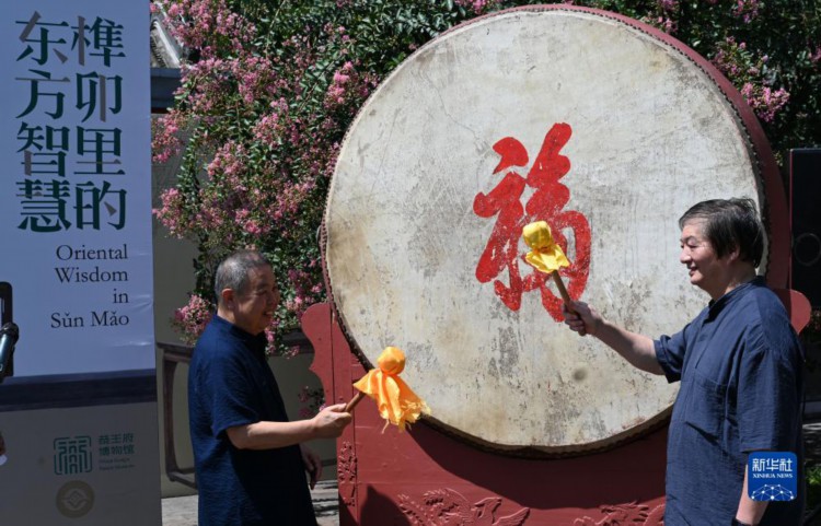 8月21日,京作硬木家具制作技艺国家级代表性传承人种桂友(左)、明式家具制作技艺国家级代表性传承人许建平共同为展览击鼓开幕。 当日,“榫卯里的东方智慧——国家级非物质文化遗产传统家具制作技艺精品展”在北京恭王府博物馆开幕。本次展览分为“东方智慧”“京华甲第”“苏州造物”“岭表华章”“续古为潮”五个单元,集中展示国家级非物质文化遗产代表性传承人的家具制作技艺代表作品,同时展示恭王府博物馆馆藏相关明清家具。 新华社记者 金良快 摄