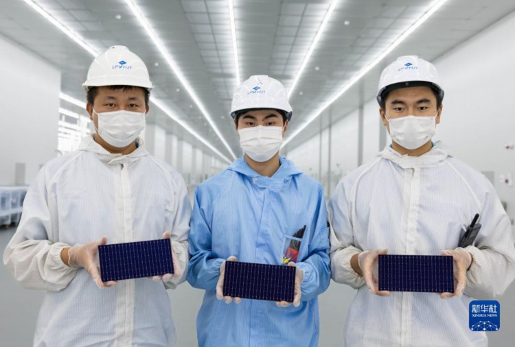 8月22日,在四川省丹棱县经济开发区的眉山琏升光伏8GW高效异质结电池项目电池车间,员工手捧第一批下线的异质结电池成品。 当日,位于四川省丹棱县经济开发区的眉山琏升光伏8GW高效异质结电池项目投产,首片高效异质结太阳能电池片正式下线。眉山琏升光伏8GW高效异质结太阳能电池项目,总投资达45亿元,是四川省2023年重点建设项目。 新华社记者 江宏景 摄