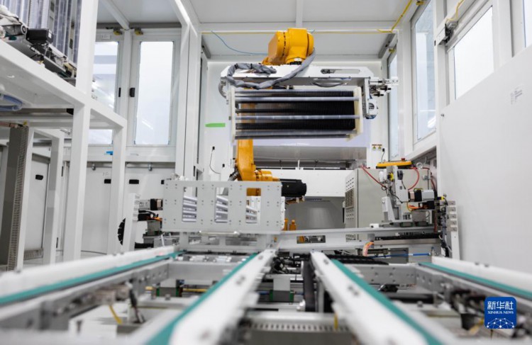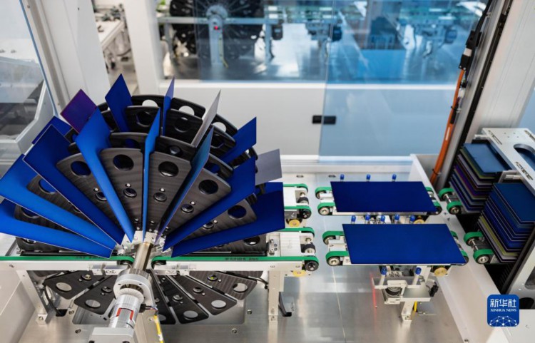 8月22日,在四川省丹棱县经济开发区的眉山琏升光伏8GW高效异质结电池项目电池车间,智能机器人搬运物料。 当日,位于四川省丹棱县经济开发区的眉山琏升光伏8GW高效异质结电池项目投产,首片高效异质结太阳能电池片正式下线。眉山琏升光伏8GW高效异质结太阳能电池项目,总投资达45亿元,是四川省2023年重点建设项目。 新华社记者 江宏景 摄