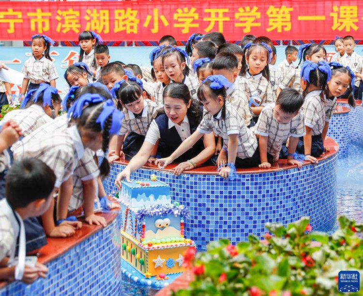 8月28日,南宁市滨湖路小学的学生们和校长谢小燕一起将学生自制的“梦想船”放入水中。 当日,广西南宁市滨湖路小学举行以“播种科学梦想”为主题的“开学第一课”暨科创节开幕式活动,通过科学情景剧、科学小实验、科学梦想分享等方式引导学生感受科学的魅力,让探索未知、创新实践的种子在学生心中生根发芽。 新华社记者 胡星宇 摄 |