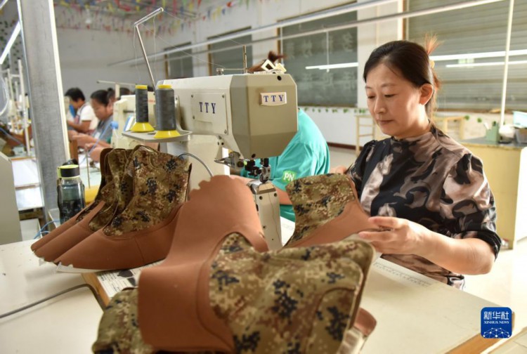 8月29日,工人在河北省威县香花营村一家制鞋厂生产车间工作。 近年来,河北省邢台市威县实施“筑巢引凤”就业工程,积极拓宽农村劳动力就业渠道,立足县域实际,引导服饰、箱包、制鞋等各类“微工厂”进镇入村,采取短期用工、季节用工、临时用工等多种灵活方式,将就业岗位送到村民家门口,不断吸纳农村劳务人员留乡回乡就业。目前,威县已发展村镇“微工厂”200余家,吸纳8000余名村民就地实现就业。 新华社记者 朱旭东 摄