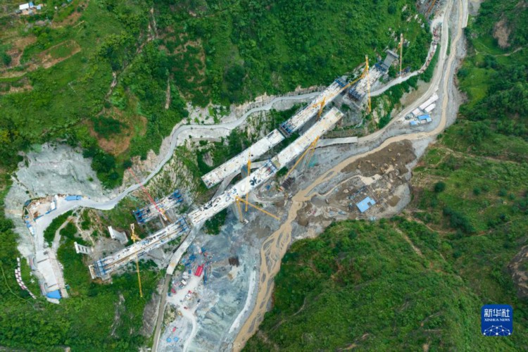 8月30日拍摄的位于金阳县境内芦稿林河下游的蜀道集团沿江高速JN1(金宁一)标段项目部钢筋加工场民工驻地板房(右上)已被山洪冲毁(无人机照片)。