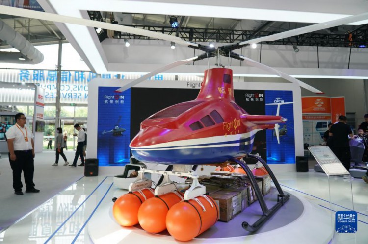 这是9月3日在首钢园拍摄的一款应急救援无人直升机。 2023年中国国际服务贸易交易会于9月2日至9月6日在北京举办,众多科技产品亮相展区,吸引观众驻足参观。 新华社记者 张晨霖 摄
