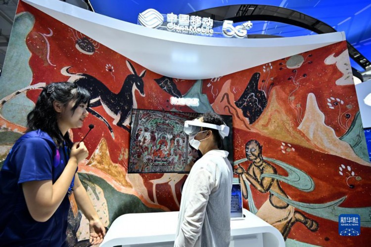 9月3日,一名参观者在首钢园中国移动展台体验基于AR/VR特效的敦煌导览,沉浸式感受敦煌壁画的魅力。 2023年中国国际服务贸易交易会于9月2日至9月6日在北京举办,众多科技产品亮相展区,吸引观众驻足参观。 新华社记者 李鑫 摄