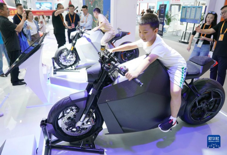 9月3日,一名小朋友在首钢园体验电动摩托车。 2023年中国国际服务贸易交易会于9月2日至9月6日在北京举办,众多科技产品亮相展区,吸引观众驻足参观。 新华社记者 张晨霖 摄