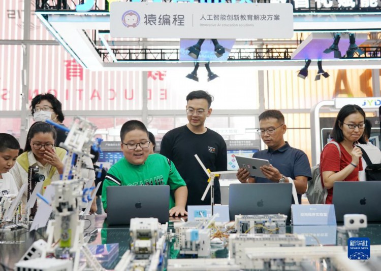 9月3日,在首钢园教育服务专题展区,小朋友在体验智能硬件编程作品。 2023年中国国际服务贸易交易会于9月2日至9月6日在北京举办,众多科技产品亮相展区,吸引观众驻足参观。 新华社记者 张晨霖 摄