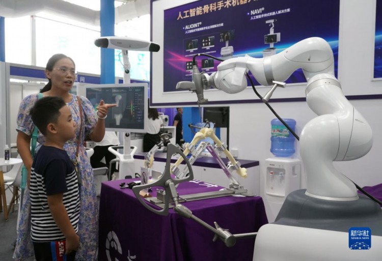 这是9月3日在首钢园拍摄的一款人工智能骨科手术机器人。 2023年中国国际服务贸易交易会于9月2日至9月6日在北京举办,众多科技产品亮相展区,吸引观众驻足参观。 新华社记者 任超 摄