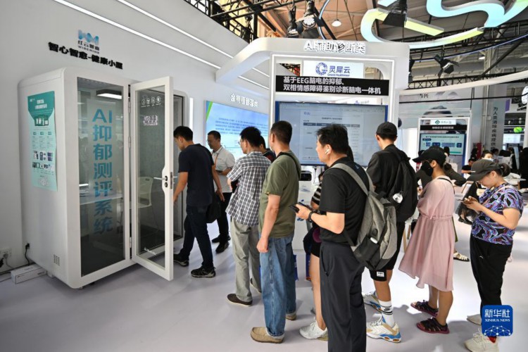 9月3日,参观者在首钢园北京安定医院展台内排队体验AI抑郁测评系统。 2023年中国国际服务贸易交易会于9月2日至9月6日在北京举办,众多科技产品亮相展区,吸引观众驻足参观。 新华社记者 李鑫 摄