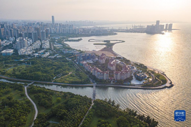 9月1日在海南省海口市拍摄的海口湾景色(无人机照片)。海口湾位于海南省海口市中心区,海湾面积268.2平方千米,打造了“椰风海韵、湾城融通”的海湾景观,是海口市发展的重要依托和生态名片。