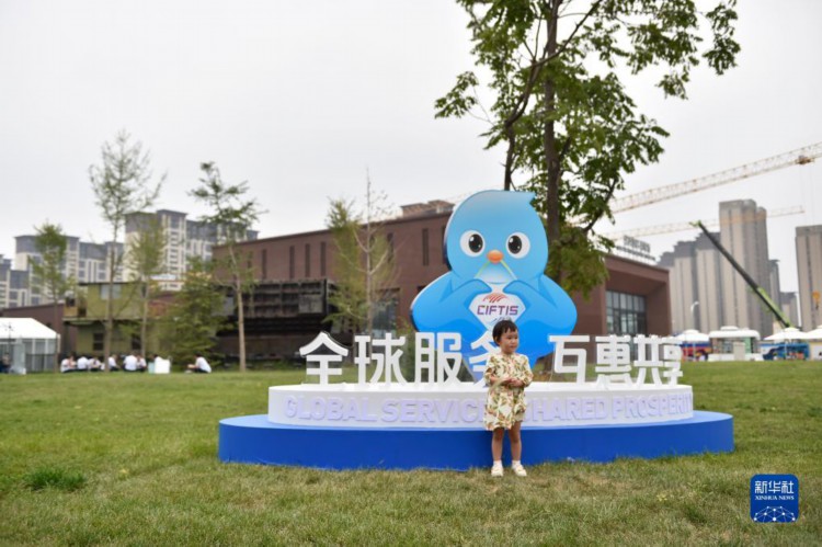 9月2日,在服贸会首钢园区,小观众与“福燕”雕塑合影留念。 2023年中国国际服务贸易交易会吉祥物“福燕”形象取材于北京雨燕,名字谐音“赴宴”,寓意邀请国内外展商及观众共赴服务贸易盛宴。2023年服贸会上,基于“福燕”形象创作的各类文创产品广受人们喜爱。 新华社记者 刘岭逸 摄