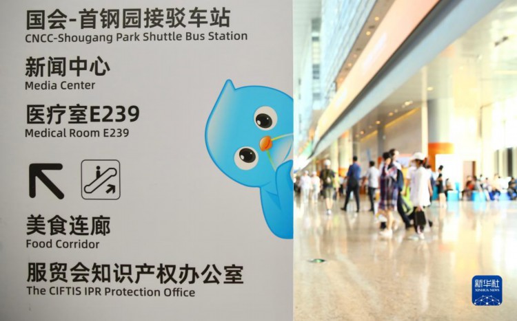 9月3日拍摄的国家会议中心的路标指示牌上的“福燕”。 2023年中国国际服务贸易交易会吉祥物“福燕”形象取材于北京雨燕,名字谐音“赴宴”,寓意邀请国内外展商及观众共赴服务贸易盛宴。2023年服贸会上,基于“福燕”形象创作的各类文创产品广受人们喜爱。 新华社记者 孙玮彤 摄