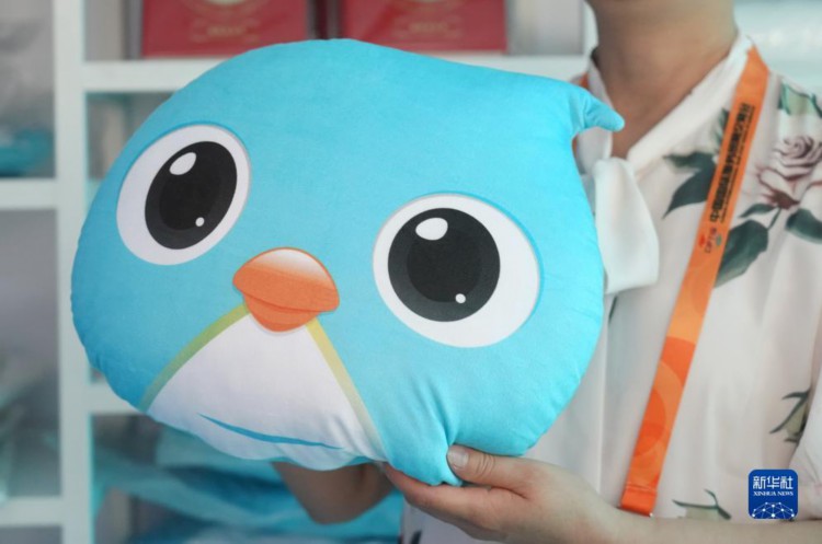 9月3日在首钢园区的一个服贸会官方特许商品店中拍摄的“福燕”抱枕。 2023年中国国际服务贸易交易会吉祥物“福燕”形象取材于北京雨燕,名字谐音“赴宴”,寓意邀请国内外展商及观众共赴服务贸易盛宴。2023年服贸会上,基于“福燕”形象创作的各类文创产品广受人们喜爱。 新华社记者 任超 摄