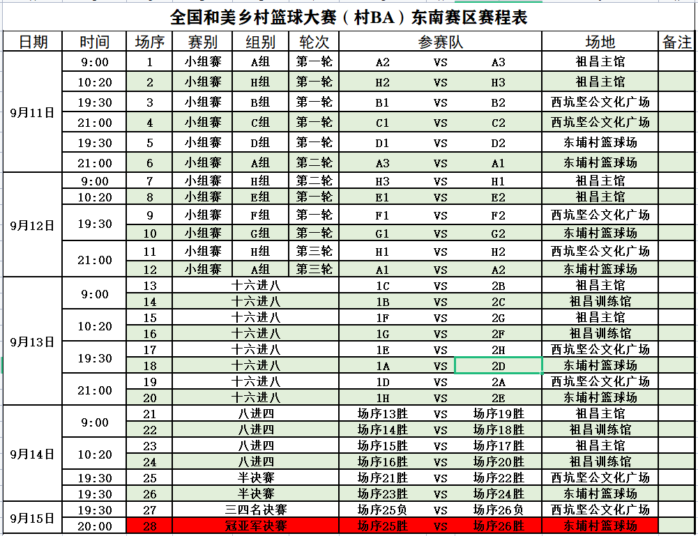 根据赛程表安排,9月11日至12日将举行小组赛,9月13日举行“16进8”比赛,白天的场次在祖昌体育馆进行,晚上的场次在东埔村篮球场、西坑坚公文化广场进行。9月14日白天,将在祖昌体育馆举行“8进4”比赛,在决出四强队伍后,两场半决赛将于当日19:30分别在东埔村篮球场和西坑坚公文化广场进行。据悉,作为室内场地,届时祖昌体育馆也将开放观众入场观赛。