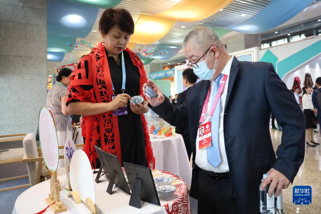 9月6日,与会嘉宾在第六届丝绸之路(敦煌)国际文化博览会上参观非遗作品。