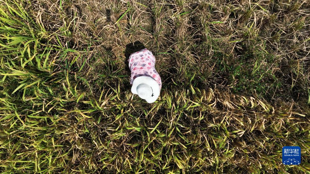 9月6日,村民在贵州省黔东南苗族侗族自治州黄平县旧州镇万亩大坝抢收稻谷(无人机照片)。