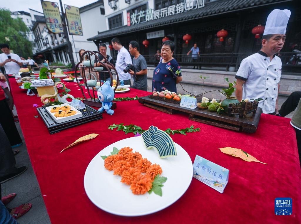 9月6日,在浙江省建德市寿昌古镇开幕的古镇好吃节上,由建德市餐饮协会制作的“鱼跃亚运”“腾龙飞天”“亚运定胜”“金牌满堂”等多道亚运主题菜品在现场展示,吸引了众多市民的眼球。