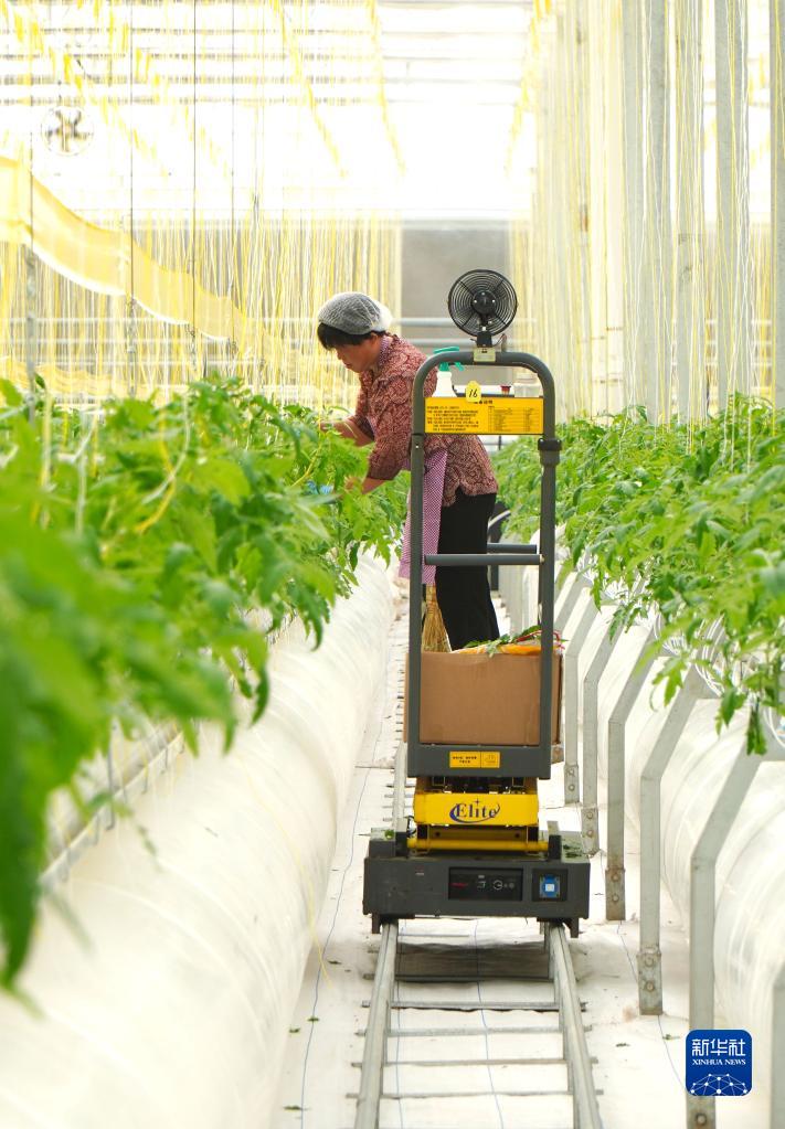 9月6日,在山东省昌邑市饮马镇,蔬菜种植户在高标准种植大棚里培育西红柿秧苗。