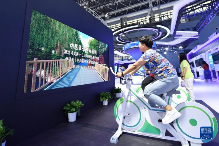 9月7日,参观者在2023中国国际数字经济博览会上体验动感单车。