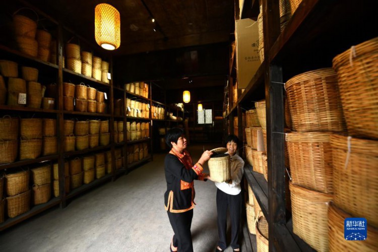 在梧州市苍梧县六堡镇黑石山茶厂,六堡茶制作技艺瑶族非遗传承人祝雪兰(左一)和汉族非遗传承人韦洁群(左二)在交流制茶技艺(9月6日摄)。