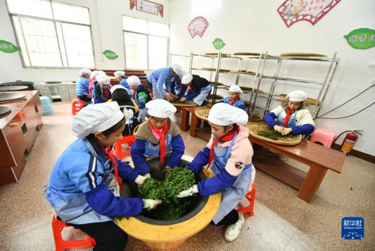 在梧州市苍梧县六堡镇中心校,小学生们在学习制茶(3月29日摄)。