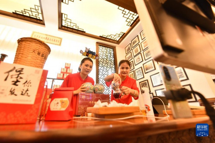 在梧州市龙圩区一家茶企,工作人员在直播带货(8月25日摄)。