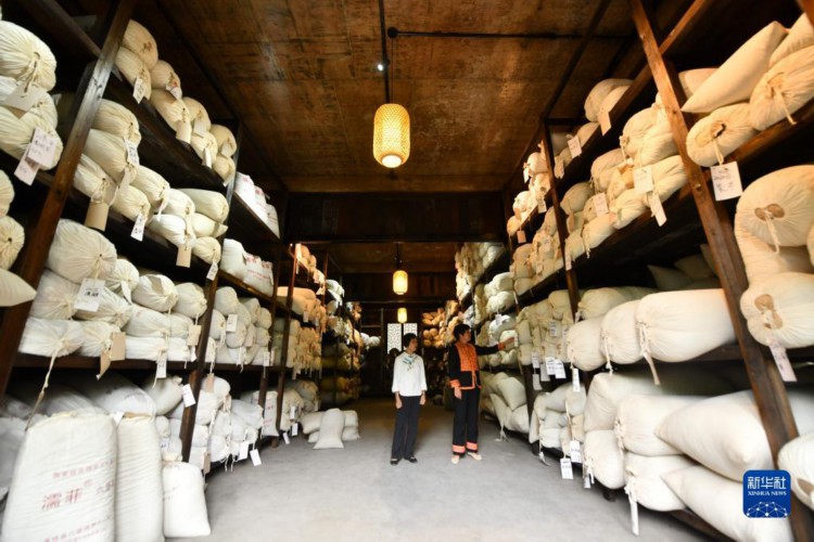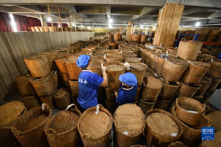 在梧州市龙圩区一家茶企,工人在陈化仓作业(8月25日摄)。