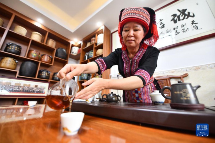 在梧州市苍梧县六堡镇山坪村,六堡茶制作技艺非遗传承人祝雪兰在工作室里泡茶(6月7日摄)。