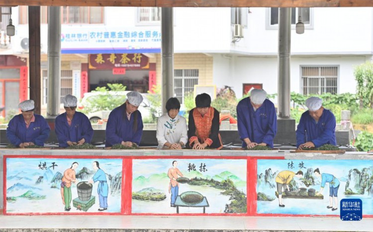在梧州市苍梧县六堡镇黑石山茶厂,六堡茶制作技艺瑶族非遗传承人祝雪兰(右三)和汉族非遗传承人韦洁群(右四)在交流制茶技艺(9月6日摄)。