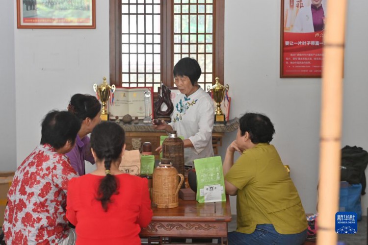 在梧州市苍梧县六堡镇黑石山茶厂,六堡茶制作技艺非遗传承人韦洁群(左二)向游客介绍茶文化(9月6日摄)。
