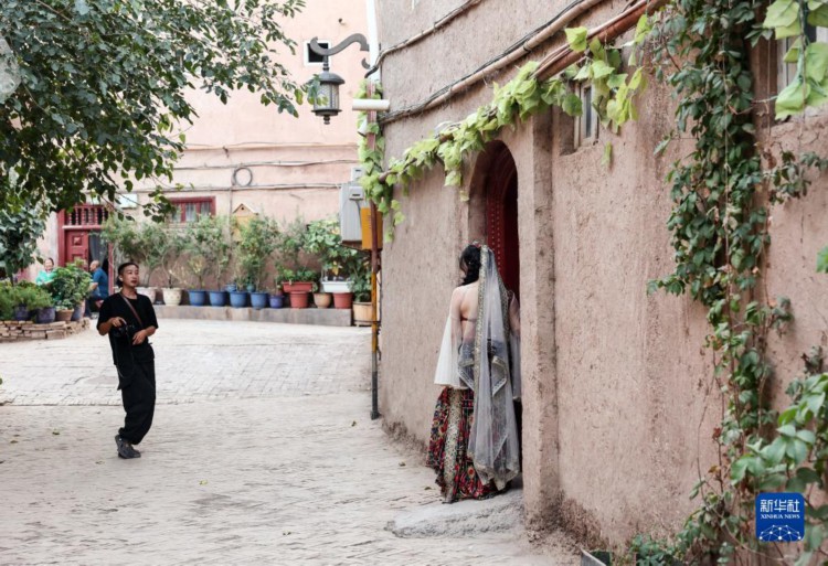 在新疆喀什古城景区内,游客在拍照留念(9月7日摄)。