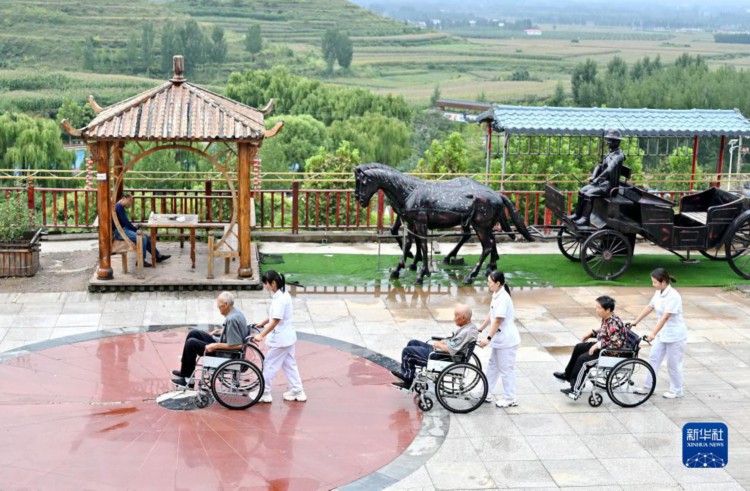9月11日,在河北省滦州市王店子镇海洋养老中心,医务人员带领老人们在庭院中散心。