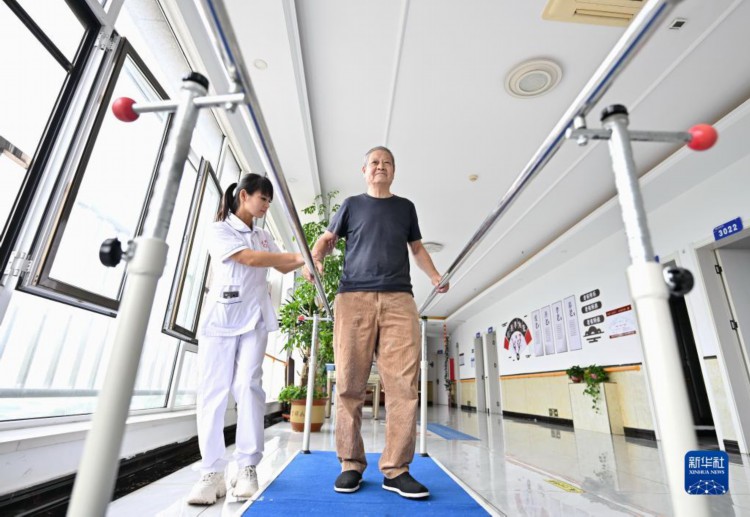 9月11日,在河北省滦州市王店子镇海洋养老中心,医务人员在指导一位老人进行康复训练。