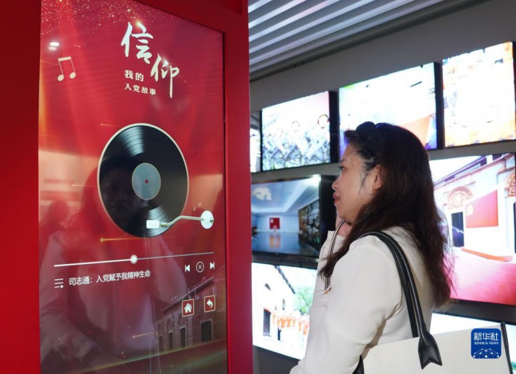9月11日,参观者通过多媒体装置聆听普通党员讲述自己的入党故事。 当日,“永恒的誓言——中国共产党入党宣誓文物史料专题展”开幕式在中共一大纪念馆举行。展览展出文物史料270件(套),引领观众在入党誓词的发展衍变中领会中国共产党人的初心和使命,从践行誓言的典范中感悟铮铮誓言中的思想内涵与精神力量。 新华社记者 刘颖 摄