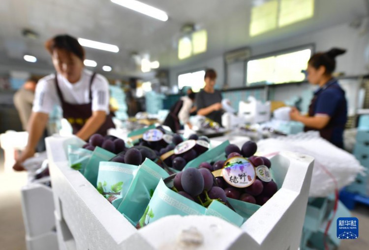 9月11日,在灯塔市古城街道康家台村,葡萄种植户在给葡萄打包装箱。 近日,辽宁省灯塔市种植的辽峰葡萄喜迎丰收。灯塔市出产的辽峰葡萄远近闻名,目前种植面积约1万亩。当地已形成葡萄培育、种植、销售、仓储、加工相关产业链,葡萄是当地农民致富增收的特色产业。 新华社记者杨青摄