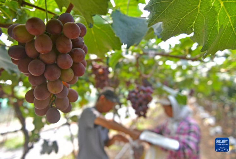 9月7日,在灯塔市柳条寨镇辽峰葡萄核心产区,种植户在大棚采摘葡萄。 近日,辽宁省灯塔市种植的辽峰葡萄喜迎丰收。灯塔市出产的辽峰葡萄远近闻名,目前种植面积约1万亩。当地已形成葡萄培育、种植、销售、仓储、加工相关产业链,葡萄是当地农民致富增收的特色产业。 新华社记者杨青摄