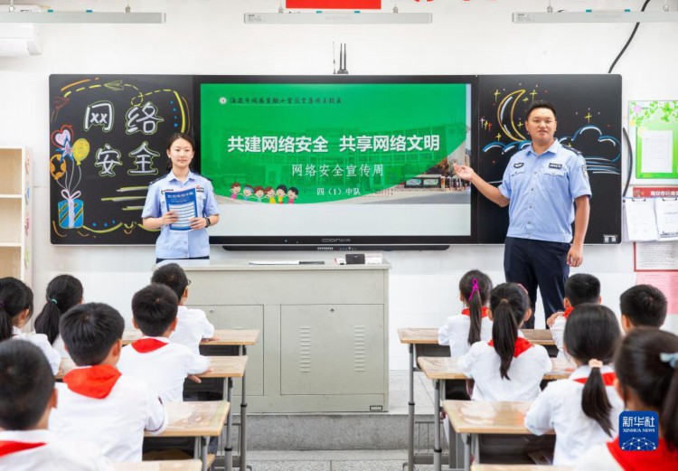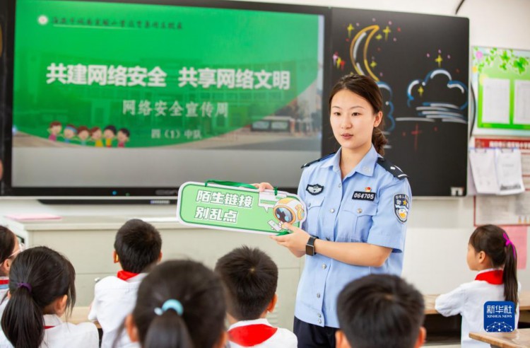 9月11日,在江苏省海安经济开发区实验小学,海安市公安局城东派出所民警在给小学生普及网络安全知识。 当日,江苏省海安经济开发区实验小学联合海安市公安局城东派出所开展“网络安全宣传进校园”活动,通过观看展板、幻灯片演示、互动问答等形式,引导小学生了解网络安全知识,提升网络文明素养。 新华社发(翟慧勇摄)