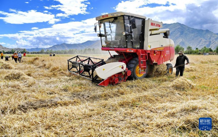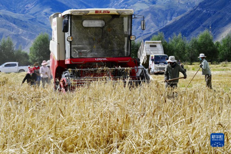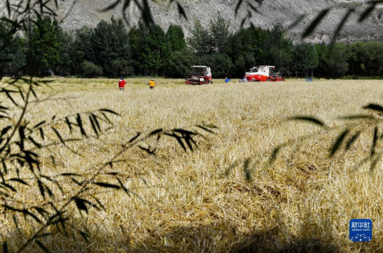 曲水县才纳乡白堆村村民收获青稞的场景(9月11日摄)。 近日,西藏拉萨市曲水县青稞成熟,人们忙着收割青稞,感受丰收的喜悦。 新华社记者 张汝锋 摄