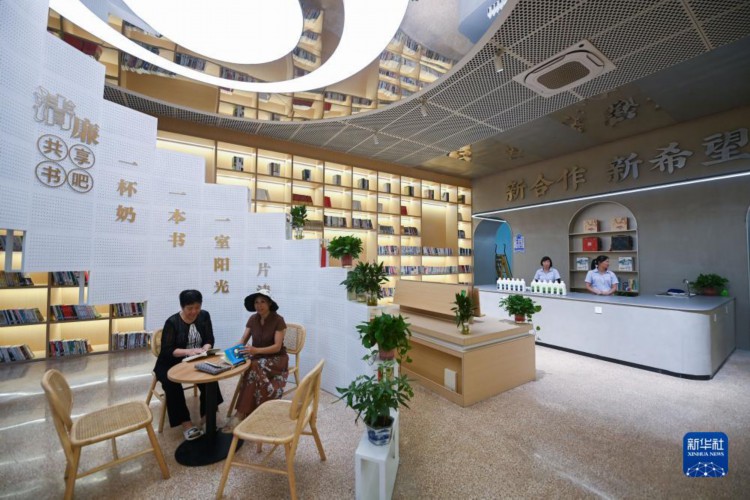 9月12日,建德市更楼街道更化社区的居民在鲜奶共富工坊的书吧内看书。