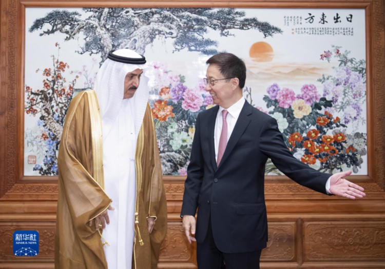 9月13日,国家副主席韩正在北京会见阿联酋联邦国民议会议长萨格尔。新华社记者 李涛 摄