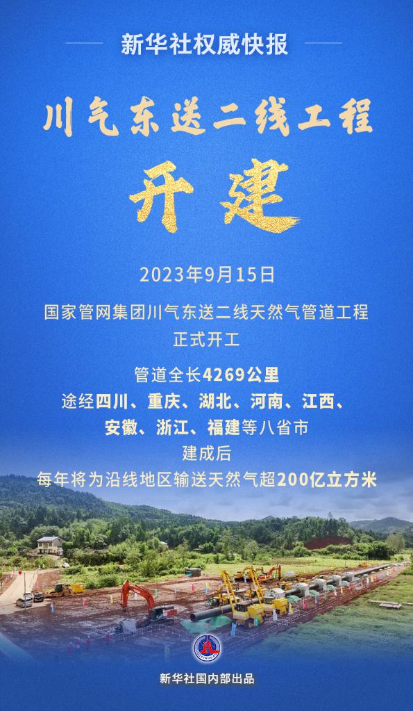 新华社北京9月15日电(记者戴小河)记者从国家管网集团获悉,公司旗下川气东送二线天然气管道工程15日开建。