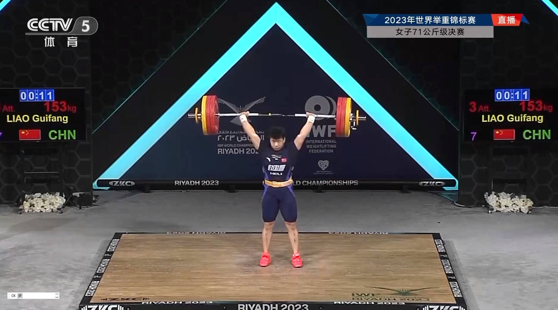 举重世锦赛女子71公斤级决赛,廖桂芳153公斤破挺举世界纪录夺冠。