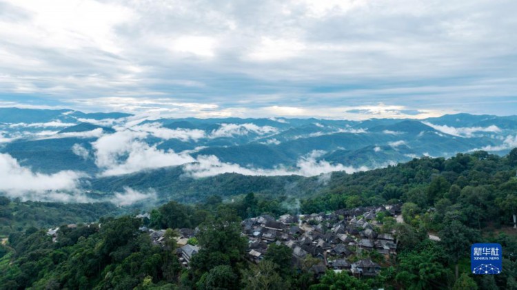 被山林与茶园环绕的景迈山翁基古寨一景(无人机照片,9月17日摄)。新华社记者 胡超 摄