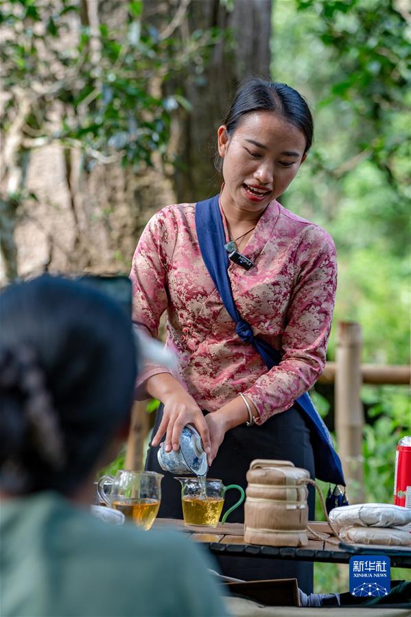 在景迈山大平掌古茶林,一位傣族姑娘在直播卖茶(9月14日摄)。