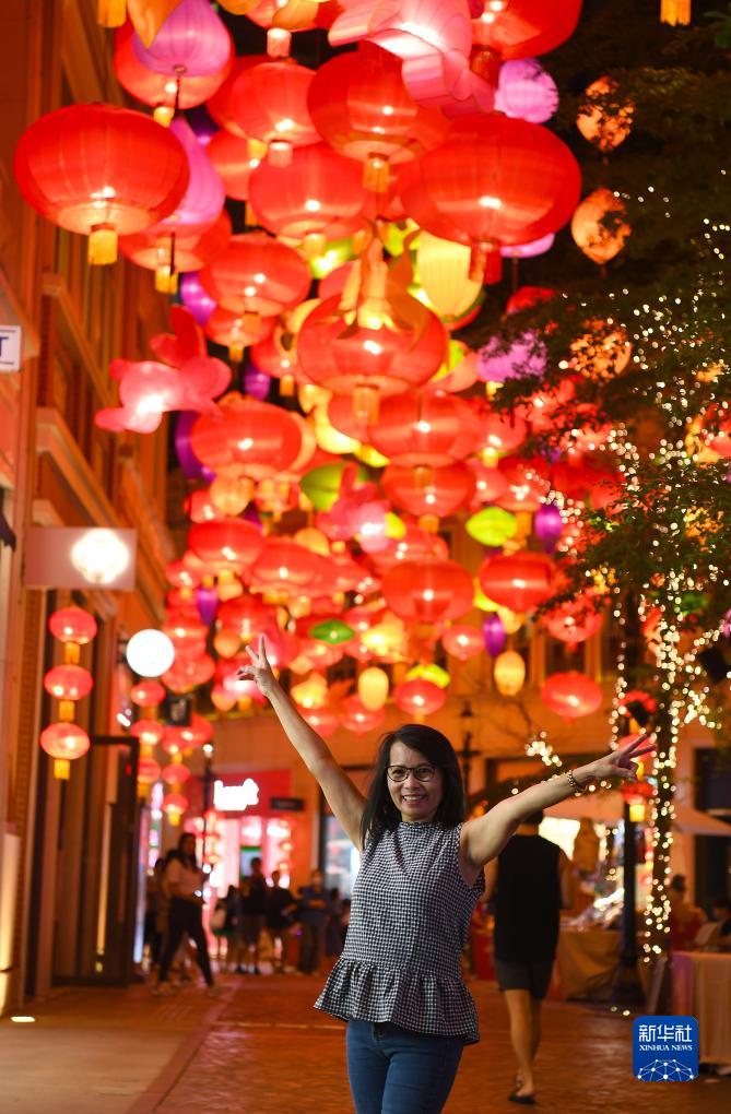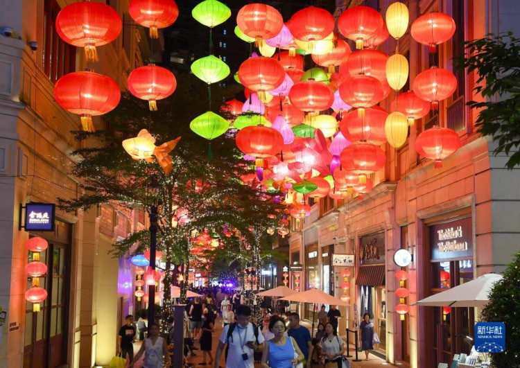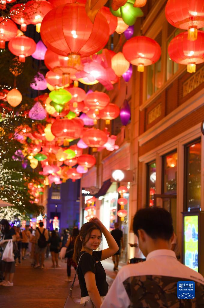 9月17日,人们在利东街观赏彩灯。 为迎接中秋佳节的到来,香港利东街举办“跃兔·迎月”户外彩灯会。约200米长的林荫大道悬挂起800多个五彩缤纷的中式灯笼,营造出喜庆的佳节气氛。 新华社记者 陈铎 摄