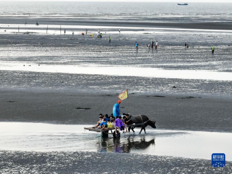 9月16日,游客在启东“十里海湾”滩涂上体验坐牛车(无人机照片)。 近年来,江苏省启东市依托丰富的旅游资源和独特的区位优势,加快文旅融合发展,不断扩大旅游产品供给,持续完善基础设施建设和接待服务设施建设,推动旅游业高质量发展。 新华社记者 季春鹏 摄