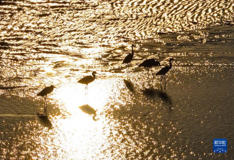 鸟儿栖息在盐城东台条子泥湿地滩涂(2023年9月1日摄,无人机照片)。